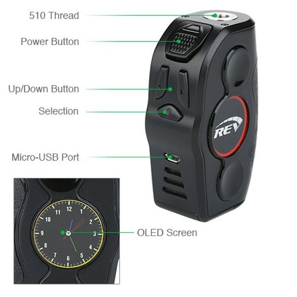 | Supplied | 1x Rev Nitro 200W Box Mod 1x Rev Rubber Keychain 1x User Manual 1x USB Cable 1x QC Card |