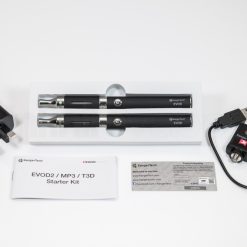 KangerTech EVOD 2 Twin Pack Starter kit. Fitted with the EVOD 650mah battery, and EVOD 2 Clearomiser tank with replaceable Kanger 1.5ohm dual coil atomiser coils, a classic but durable starter kit. It has a 1.6ml tank & 650mah Battery lasting most users a day.